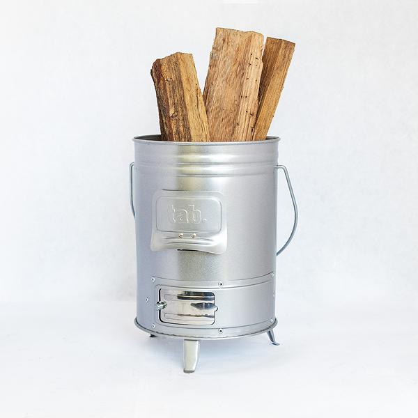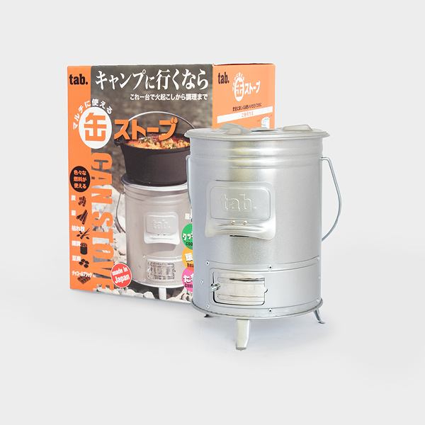 缶型の簡易ストーブ。薪や小枝を燃料として使用可能。キャンプや非常時の備えにも。